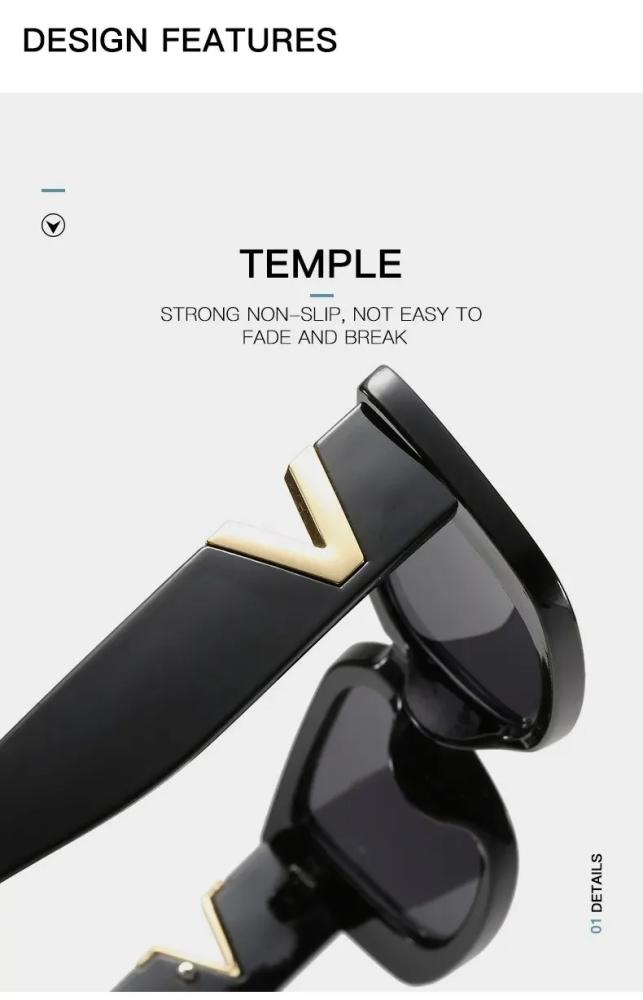 أضيفي لمسة من الأناقة العصرية مع نظارات شمسية مربعة كلاسيكية لعام 2025 للنساء، بتصميم فاخر يجمع بين الإطار الأسود الأنيق وتفاصيل الشعار الذهبي "V" المميز. تأتي مزودة بعدسات مستقطبة POLARIZED مع حماية UV400، لتوفر رؤية أوضح وحماية كاملة من أشعة الشمس الضارة. مثالية للاستخدام اليومي، السفر، والأنشطة الخارجية.